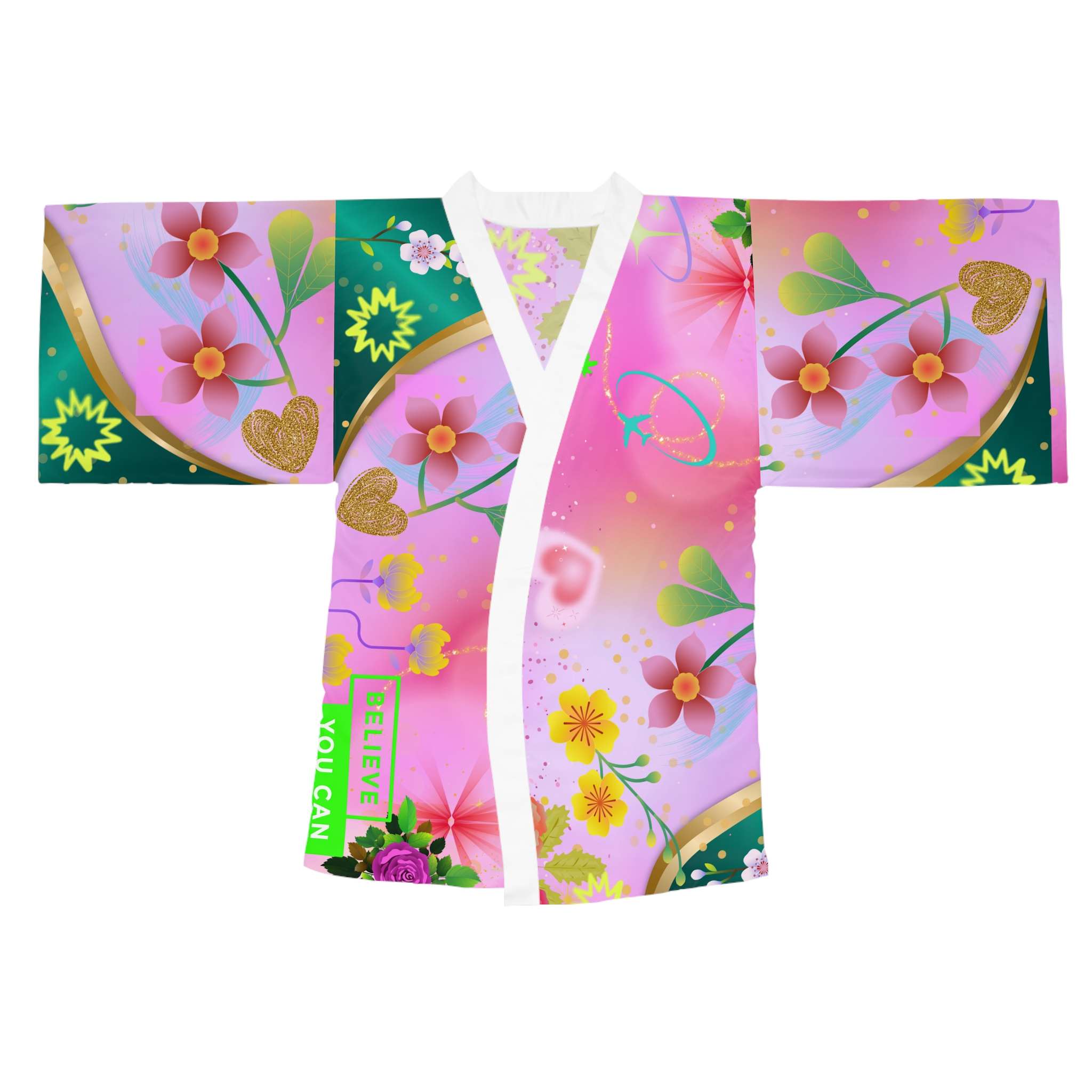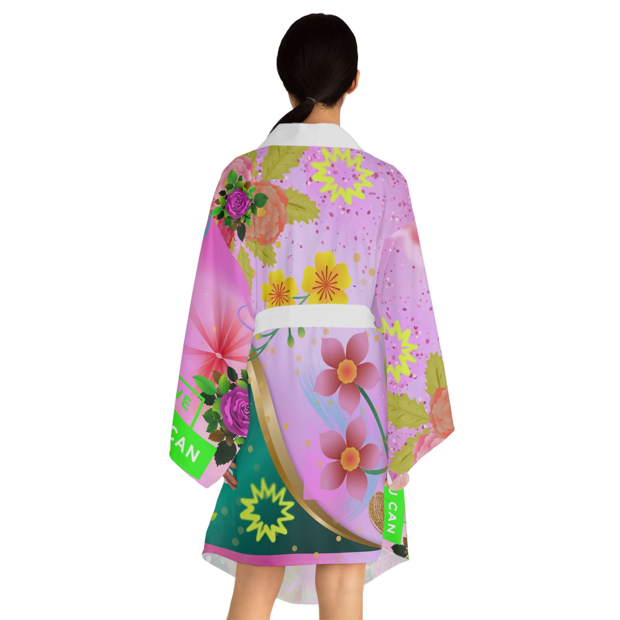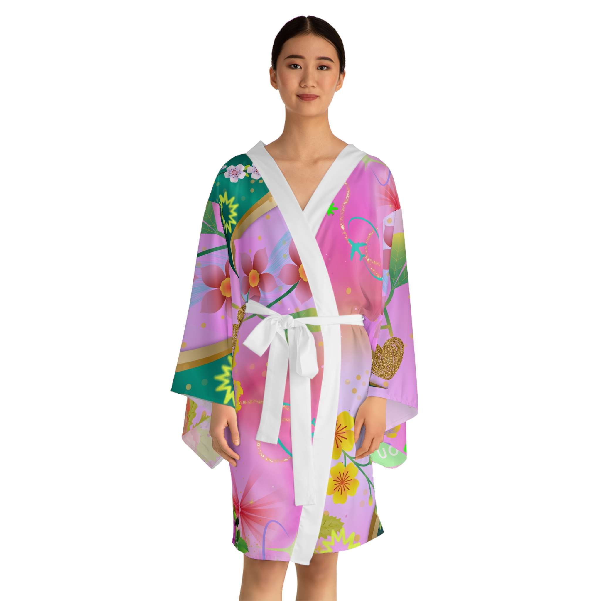 Feel special in this gorgeous kimono robe with vibrant, fun colors. Perfect for lounging at home or as a stylish party outfit. Ideal for those who enjoy adding a touch of luxury to their daily routine. Great for holidays, spa days, or self-care rituals.