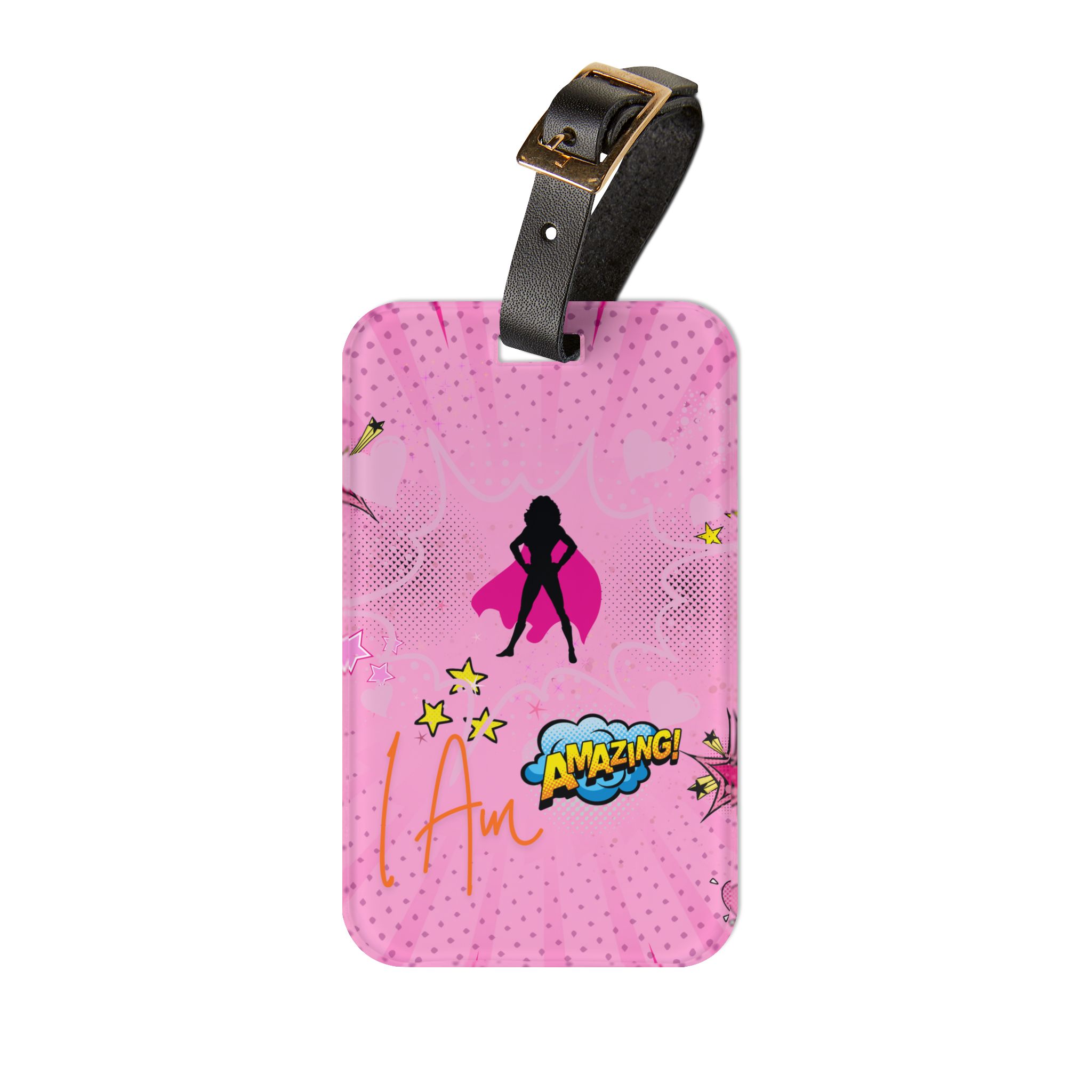This bright acrylic luggage tag brings playful confidence to every trip. The glossy, vibrant print shows a bold silhouette and pop-art accents against a happy pink backdrop — a small statement that makes your bag easy to spot on a busy carousel. The tag slips onto handles with an adjustable black leather strap and hides a refillable business-card slot on the back for your contact details. Lightweight and durable, it stands up to travel bumps while keeping your bag unmistakably yours.