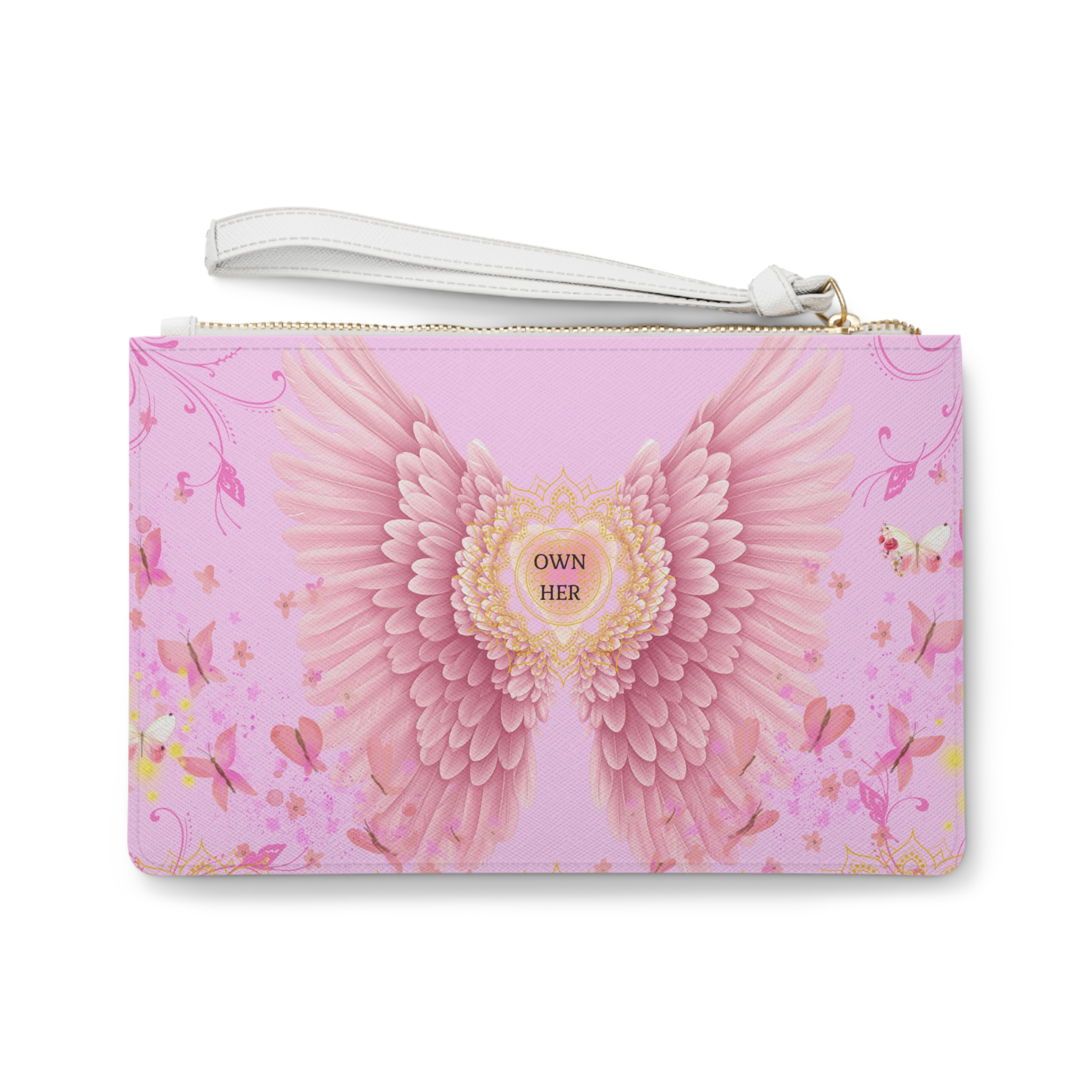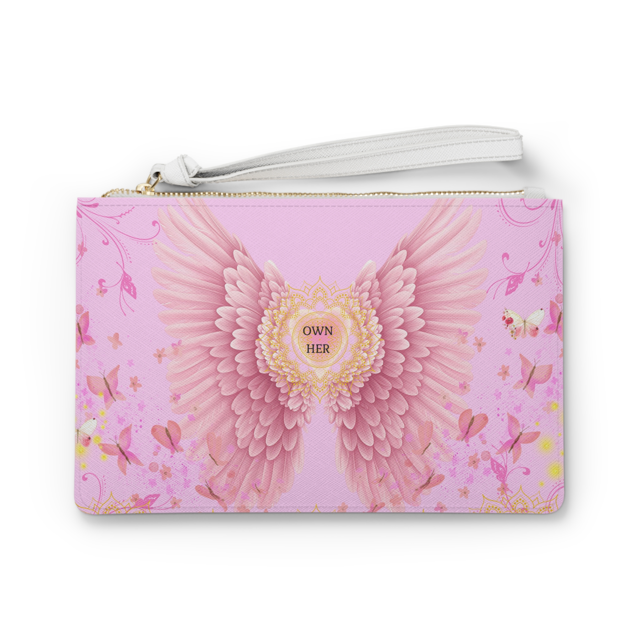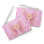 Soft, feminine, and full of quiet confidence — this clutch brings a little magic to everyday moments. Pale pink Saffiano faux leather is printed with a haloed heart and angel wings, tiny butterflies, and floating petals. The wrist strap lets you carry it hands-free; inside, two compartments and a small pocket keep cards, lip balm, and keys organized. Gold-colored metal zipper and black lining add a refined contrast. Lightweight and polished, it slips easily into a tote or goes solo for a brunch, date night, or a day when you want to carry something that feels personal and uplifting.